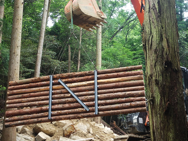 長い時間を要するため作業中の土砂崩落の恐れがある点や、丸太の間に指を挟んだり足の上に落としてしまう危険性があるなど、課題の多い工法でした。